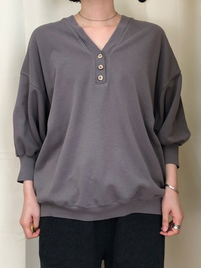 ※ショップ情報又は、About から、 -ご購入前に-の記載を必ずご確認の上ご購入お願い致します。 •ハーフボタンのスウェットシャツです◎ ユーズド感のある生地ですが、形がとても可愛い1着です◎ (実寸平置き) 着丈:70cm 肩幅:68cm 身幅:66cm 袖丈:36cm アームホール:31cm 袖口:9cm •コンディション:フロントに小さなシミ、汚れがあります。全体的に細かな毛玉がありユーズド感のある生地質です。目立ったダメージ汚れはございません。 •カラー:グレー •素材:表記なし 着用画像身長169cm ◎Instagram:badu_usedclothing