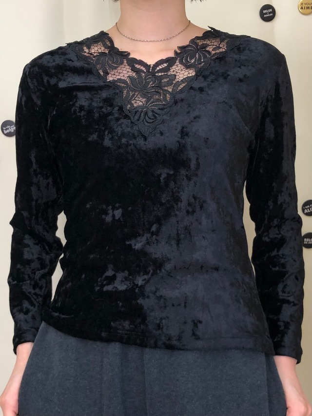 ※ショップ情報又は、About から、 -ご購入前に-の記載を必ずご確認の上ご購入お願い致します。 •胸元がレースになっているベロアトップスです◎ (実寸平置き) 着丈:57cm 肩幅:45cm 身幅:46cm 袖丈:58cm アームホール:23cm 袖口:10cm •コンディション:目立ったダメージ汚れはございません。 •カラー:ブラック •素材:ポリエステル94% エラスタン6% 着用画像身長169cm ◎Instagram:badu_usedclothing