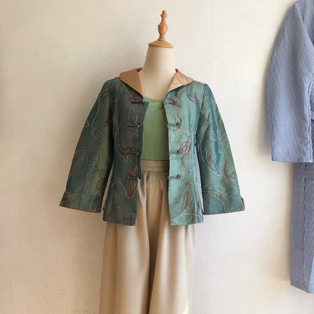※ショップ情報又は、About から、 -ご購入前に-の記載を必ずご確認の上ご購入お願い致します。 •刺繍チャイナジャケット◎ (実寸平置き) 着丈:58cm 肩幅:39cm 袖丈:50cm 身幅:46cm ウエスト: 41cm •コンディション:袖、後ろ肩付近シミあり。画像にて詳細がございます。目立ったダメージ汚れはございません。 •カラー:ミントグリーン •素材表記:コットン65% ポリエステル35% 着用者身長167cm ◎Instagram:badu_usedclothing