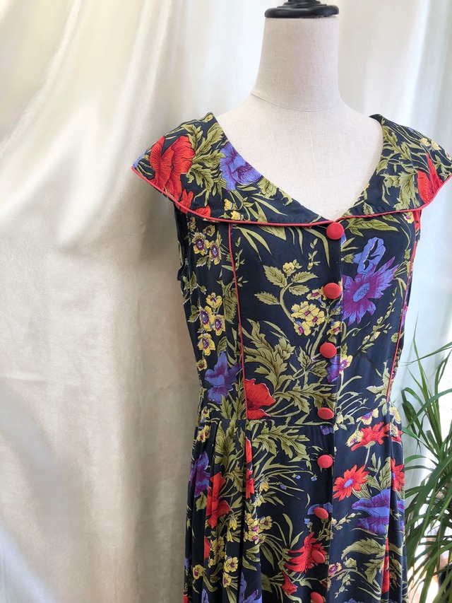 ※ショップ情報又は、About から、 -ご購入前に-の記載を必ずご確認の上ご購入お願い致します。 •セーラーカラーのフラワープリントドレスです◎ (実寸平置き) 着丈:109cm 肩幅:41cm 身幅:53cm アームホール:23cm ウエスト: 39cm •コンディション:全体的に劣化を感じる1着です。 •カラー:ネイビー・ミックス •素材:ビスコース 着用画像身長169cm ◎Instagram:badu_usedclothing