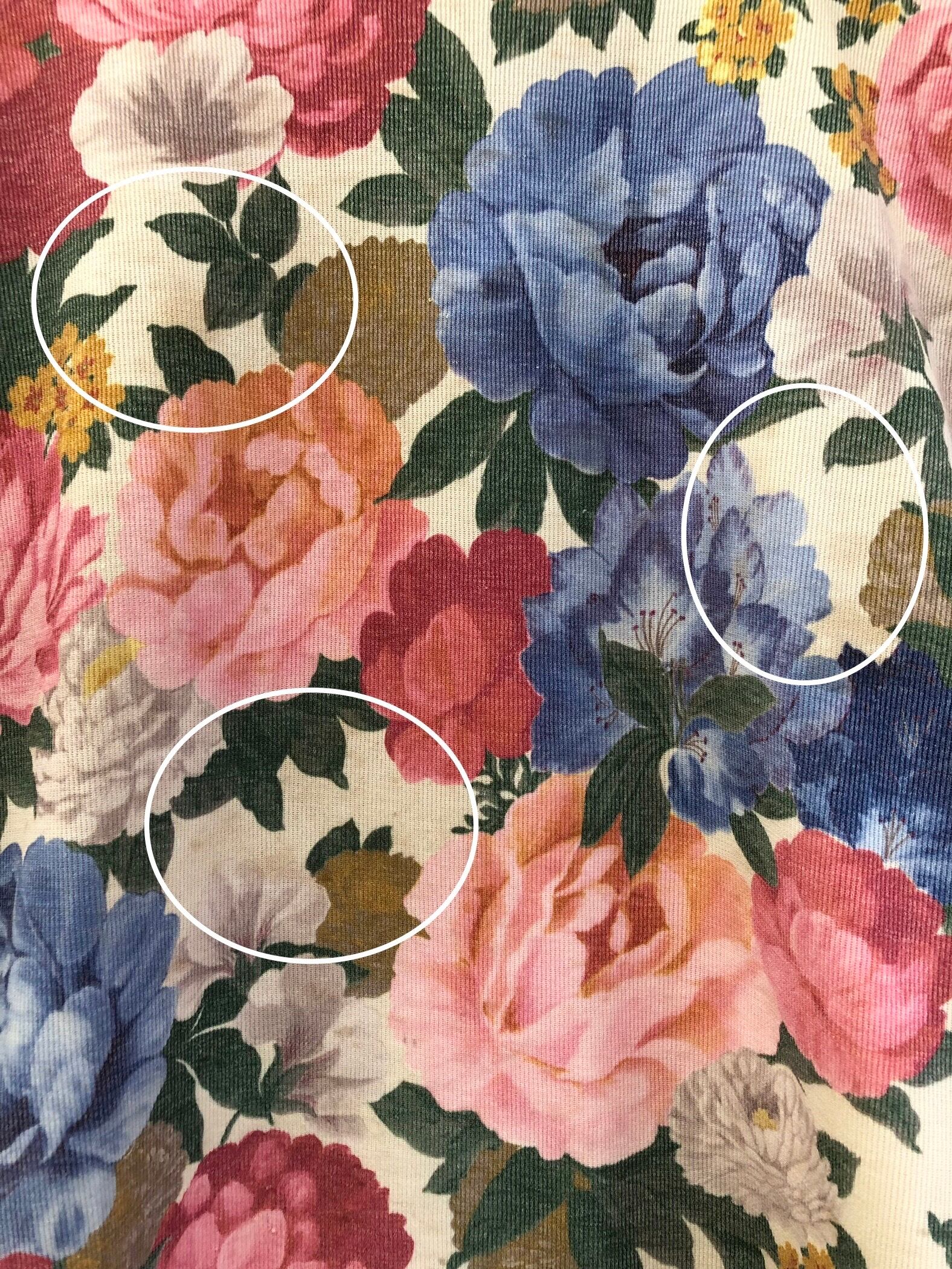 •コンディション:表面ではあまり目立ちませんが、白い箇所にシミがあり、裏を見ると全体的に薄いシミがある事が分かります。目立ったダメージ汚れはございません。